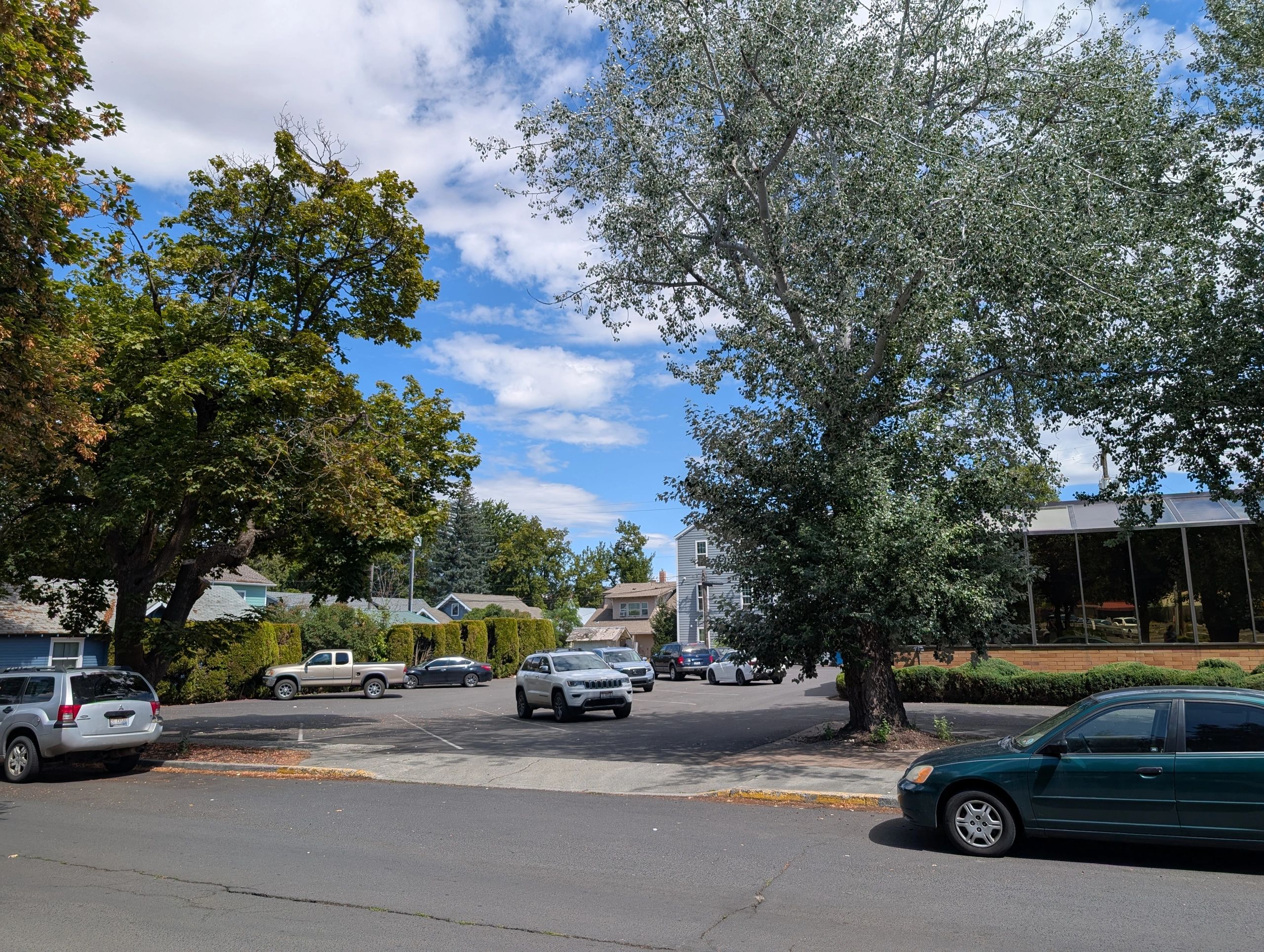 Photo of Plaza West parking lot from corner of Asbury near 6th Street. (cars may vary 😉)