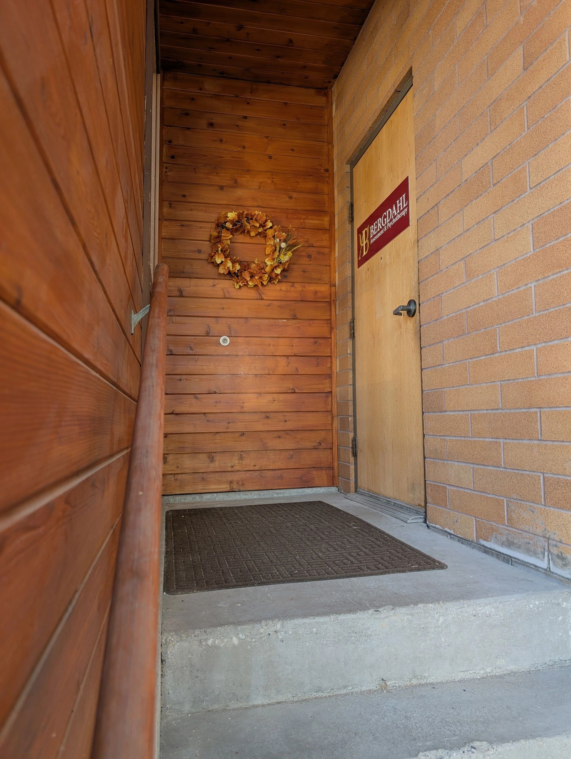 Photo of office entrance from the parking lot. Handicap accessible entrance is around the front of the building up the ramp.